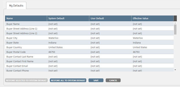 To restore the system default, select the row by clicking the default under the “User Default” and then clicking the button “Restore Selected to System Default”.