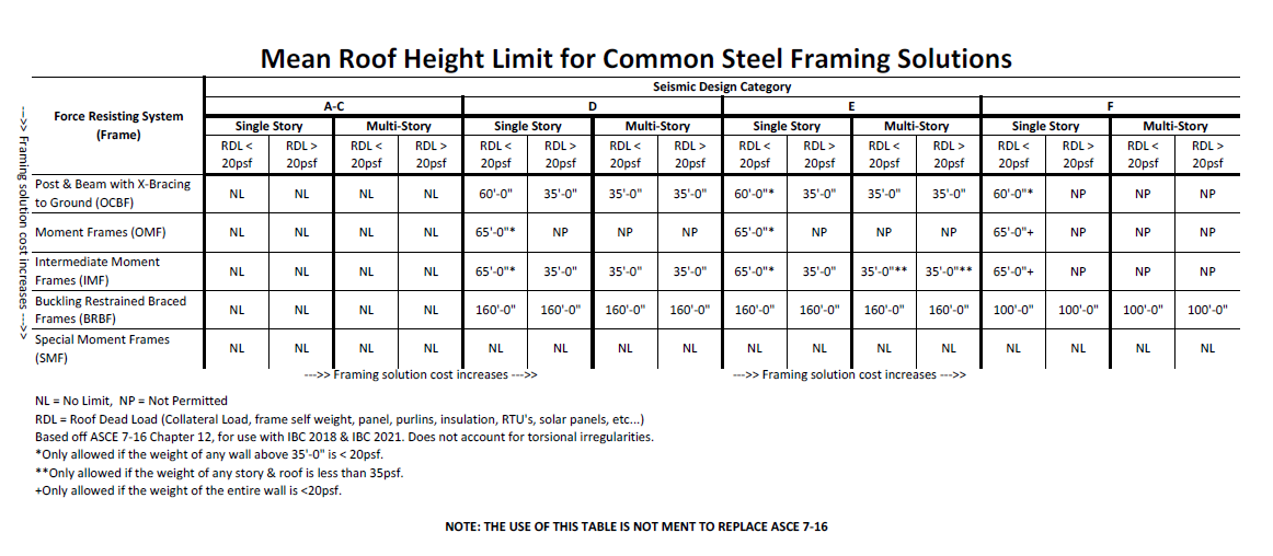 Nucor’s typical primary force resisting system is accomplished through a standard Post & Beam (OCBF) and Rigid Frame (OMF). There are times when these framing systems are not permitted, as shown in the table above. Alternate framing systems: IMF (Intermediate Moment Frames), SMF (Special Moment Frames), and BRBF (Buckle Restrained Brace Frames) increase the limitations, but come at a price. The use of these framing solutions require additional review and approval.