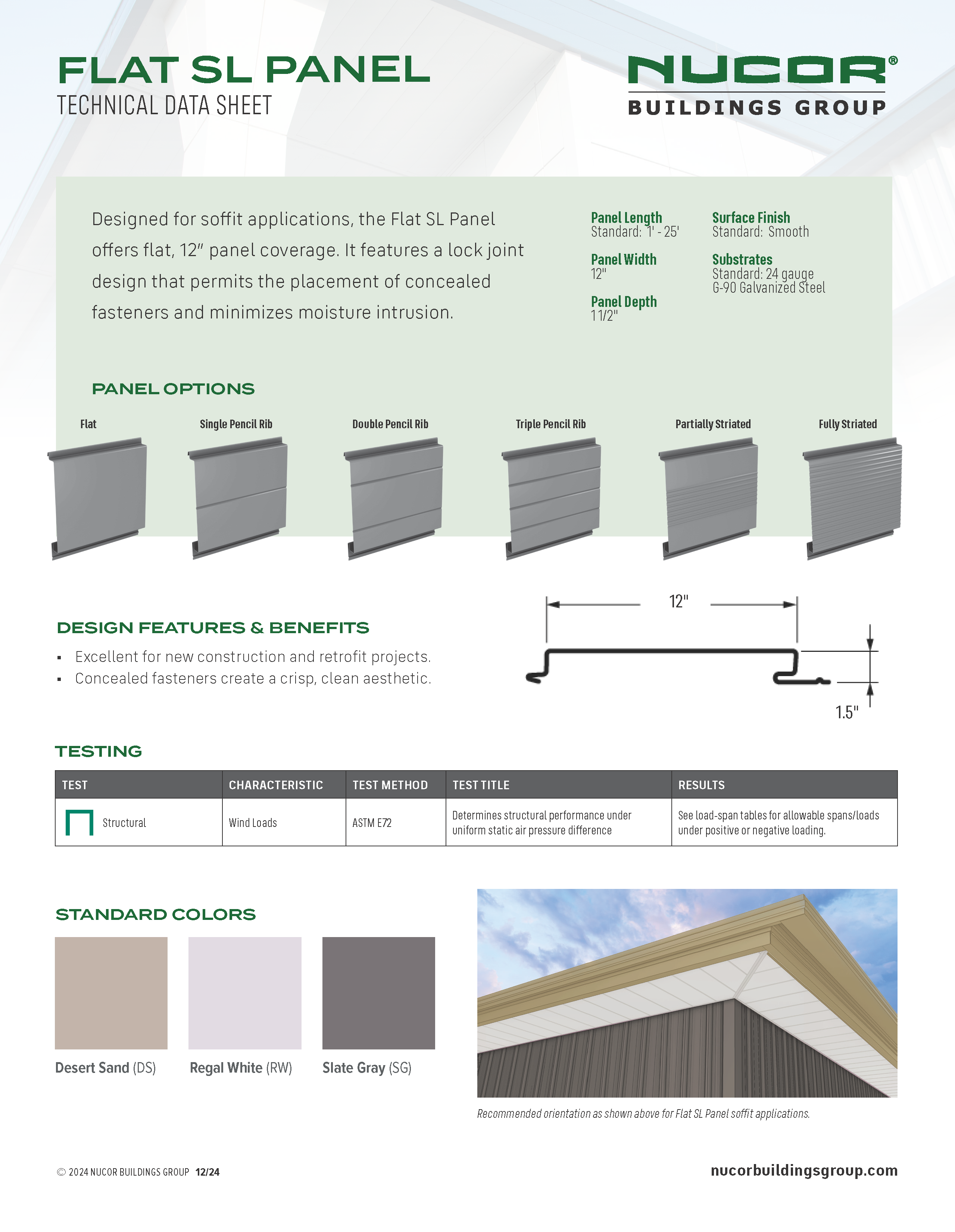 We are excited to announce the availability of a new soffit panel — the Flat SL Panel. Designed for soffit applications, the Flat SL Panel offers flat, 12″ panel coverage. It features a lock joint design that permits the placement of concealed fasteners and minimizes moisture intrusion.