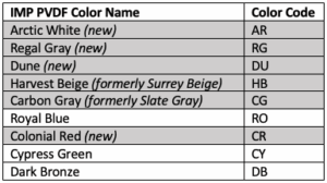 Nucor Building Systems is introducing four new IMP PVDF colors, each replacing an existing color in the lineup. Additionally, two colors have been renamed, and three colors have been removed.